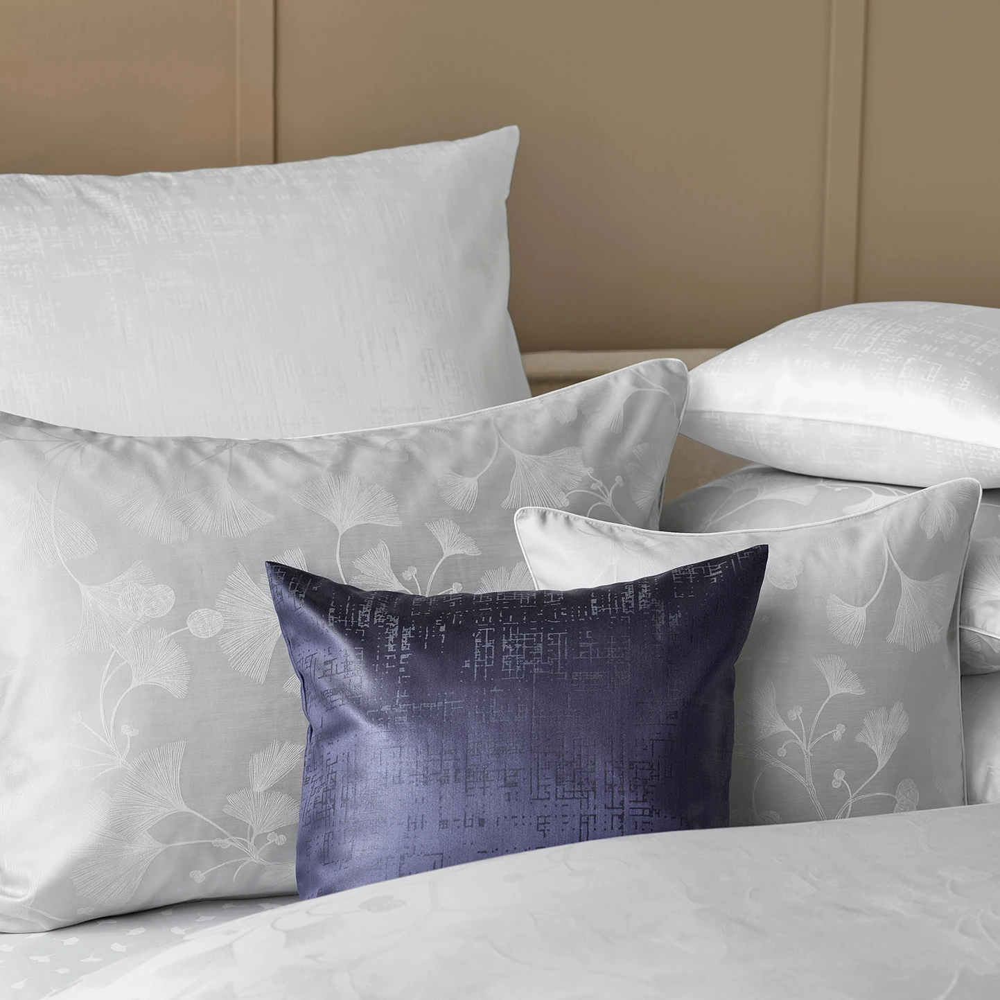 Tipp: Kombinieren Sie AIKO mit unifarbenen Satin- oder Jersey-Spannbettlaken in abgestimmten Nuancen und setzen Sie mit strukturierten Plaids zusätzliche, wohnliche Highlights – so kommt das Ginkgo-Jacquard besonders edel zur Geltung.