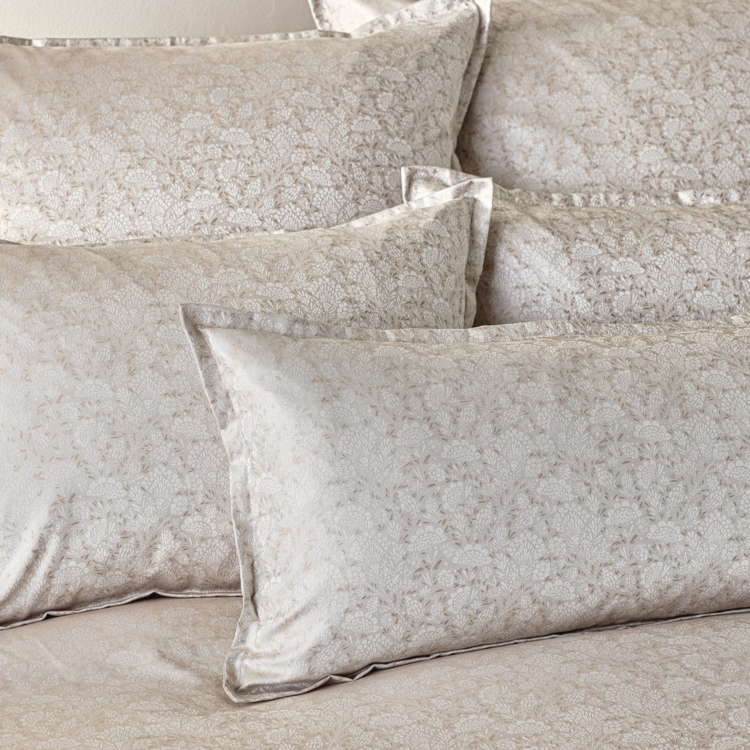Curt Bauer Bettwäsche ALEA – luxuriöser Mako-Brokat-Damast aus 100% Baumwolle. Buntgewebt, merzerisiert und bügelleicht, mit kunstvoll abstrahiertem Blumenmotiv und Kissen mit 4-seitigem Stehsaum in edlem Perlbeige.