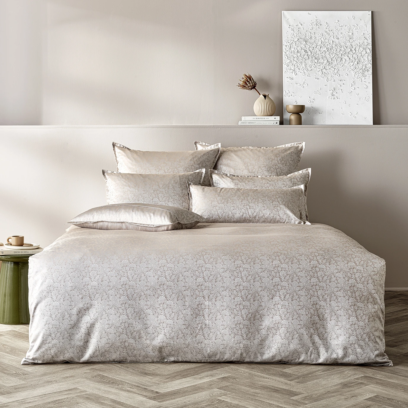 Tipp: Kombinieren Sie ALEA mit unifarbenen Spannbettlaken in Creme, Sand oder Taupe und setzen Sie mit Zierkissen in warmen Metallic-Nuancen zusätzliche Highlights – so kommt der Damastglanz in Perlbeige besonders schön zur Geltung.