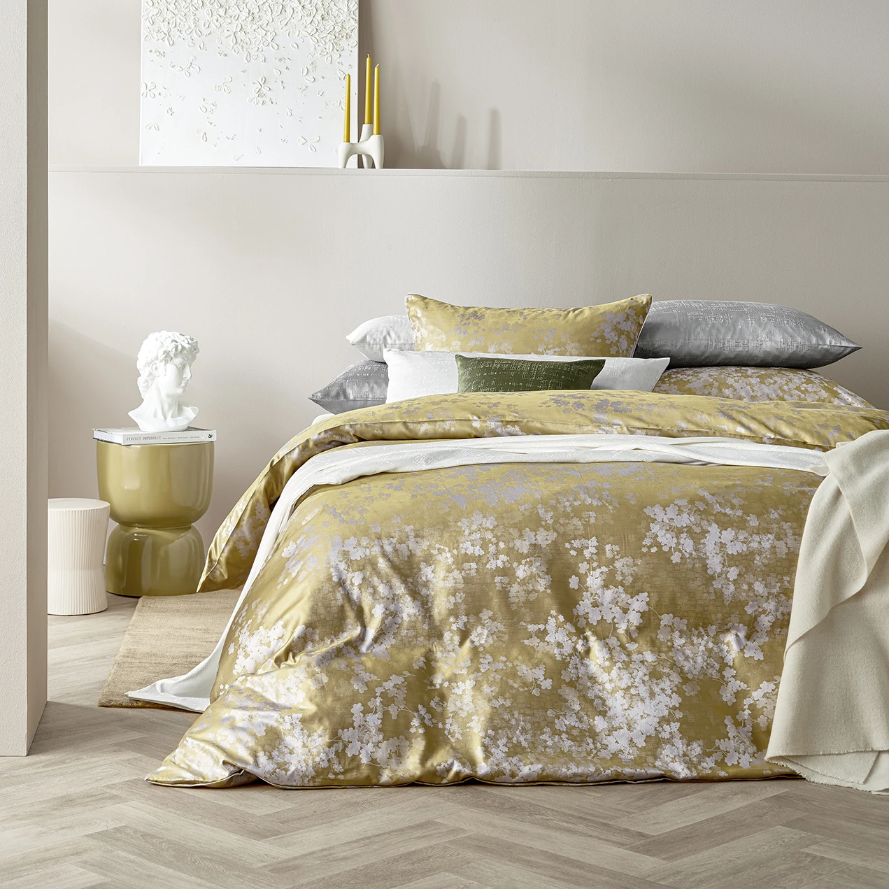 Tipp: Kombinieren Sie Flora mit unifarbenen Satin-Spannbettlaken und dekorativen Kissen in harmonischen Natur- oder Beerentönen, um die edle Webstruktur und die Farbnuancen besonders schön hervorzuheben.